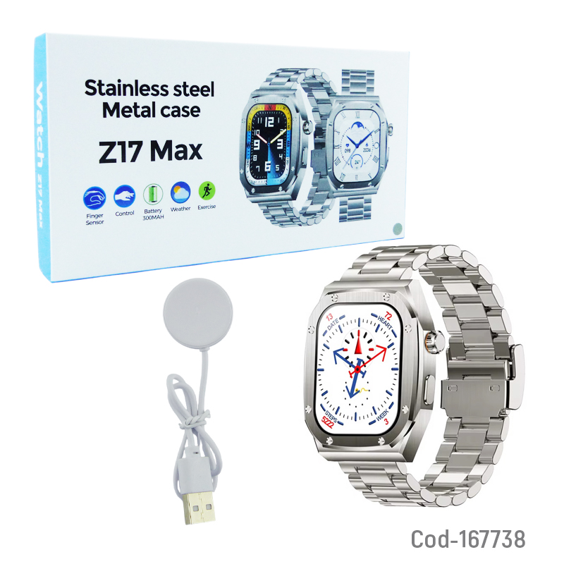 Reloj smartwatch modelo Z17MAX con malla de metal, diseño moderno y resistente. Cuenta con pantalla táctil de 2.0 pulgadas, conexión a redes y función para contestar llamadas directamente desde el reloj. Ideal para uso diario y mantenerse conectado de forma práctica. Producto presentado en caja.