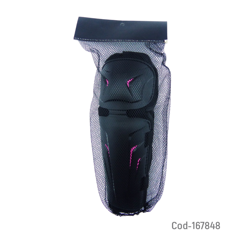 Rodillera y codera para mujer con detalles en fucsia, diseñadas para brindar protección, soporte y comodidad al manejar moto. Fabricadas con material resistente y ajuste seguro, ayudan a reducir el impacto y mejorar la seguridad durante la conducción. Producto presentado en malla.