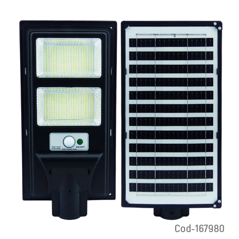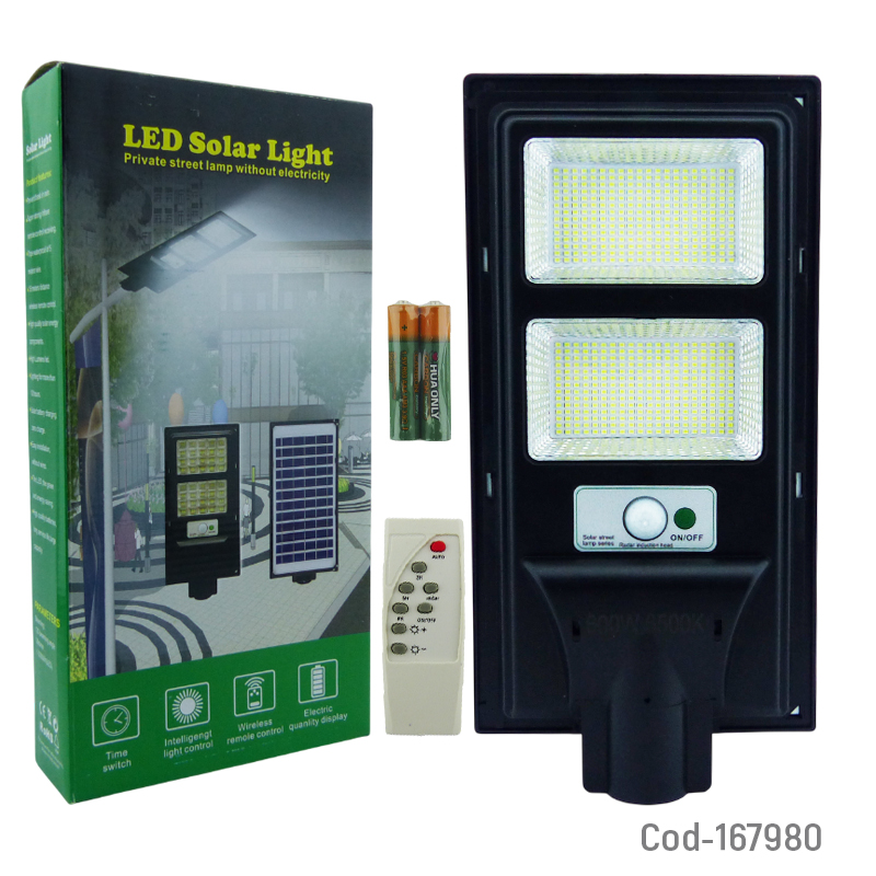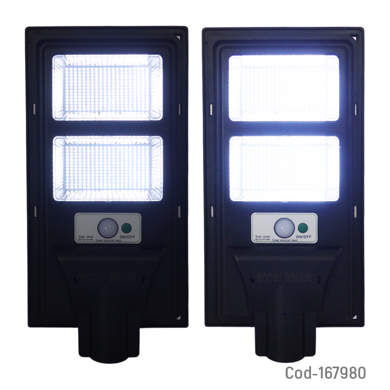 Foco para poste solar de 600 watt con 560 LED distribuidos en 2 placas, diseñado para ofrecer iluminación potente y eficiente en exteriores. Cuenta con sensor automático de encendido, control remoto para ajustar funciones y batería recargable mediante energía solar. Ideal para postes, patios, estacionamientos y áreas abiertas. Producto en caja.