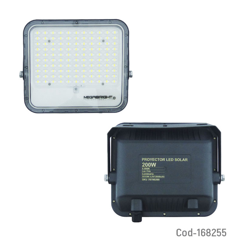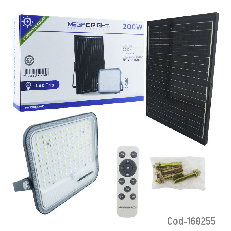 Proyector solar led de 200 watts marca MEGABRIGTH con panel de 110 led y control remoto de luz fría a 6000k, producto en caja. Ideal para iluminar patios, entradas o áreas amplias. Funciona con energía solar, cuenta con modos de encendido por control remoto y sensor automático. Alta potencia lumínica, resistente al agua y de fácil instalación.