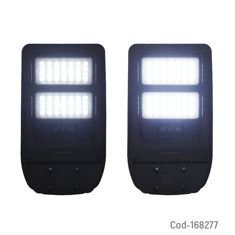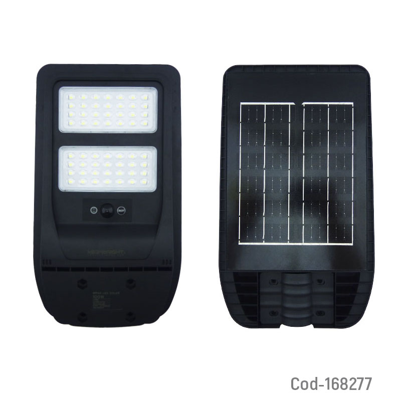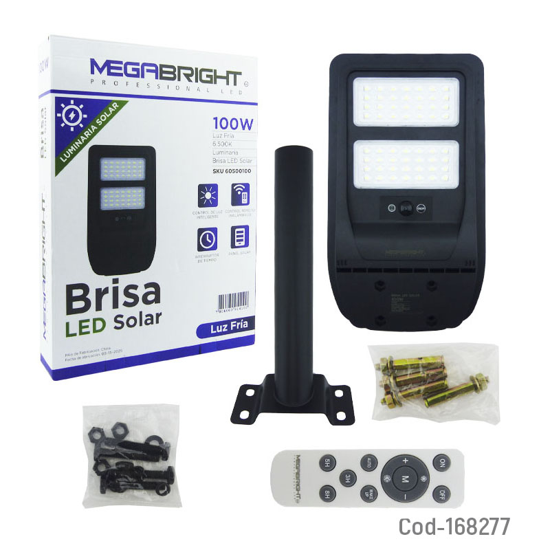 Foco con brazo solar de 100 watt y 56 led modelo BRISA marca MEGABRIGTH de 2 placas con control y sensor, producto en caja. Ideal para muros, patios o entradas. Funciona con energía solar, cuenta con sensor de movimiento y control remoto. Ofrece luz blanca potente, encendido automático y estructura resistente al exterior.