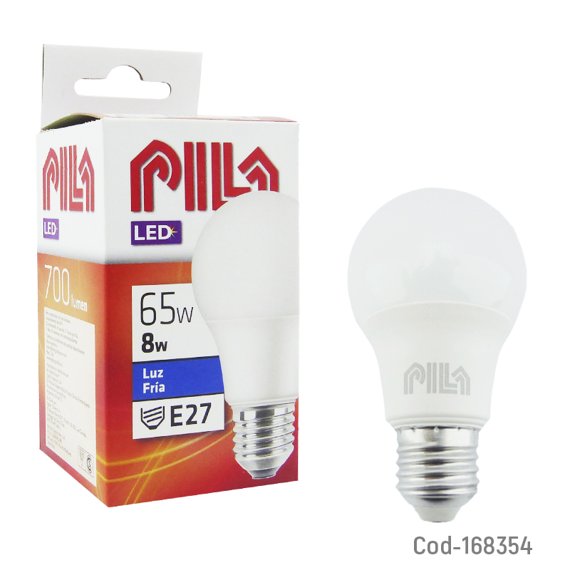 Ampolleta LED marca PILA de 8 Watt, con luz fría de 700 lúmenes, ideal para crear ambientes agradables y confortables en el hogar u oficina. Ofrece bajo consumo energético y larga duración, reemplazando eficientemente las ampolletas tradicionales. Producto en caja.