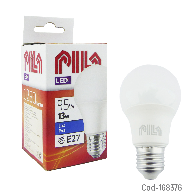 Ampolleta LED marca PILA de 13 Watt, con luz fría de 1250 lúmenes, ideal para crear ambientes agradables y confortables en el hogar u oficina. Ofrece bajo consumo energético y larga duración, reemplazando eficientemente las ampolletas tradicionales. Producto en caja.