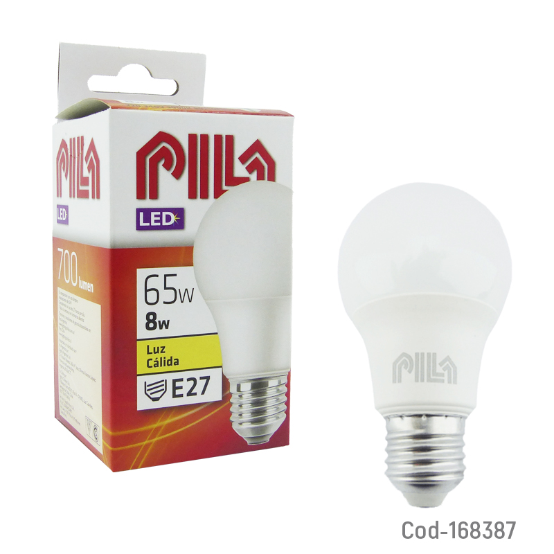 Ampolleta LED marca PILA de 8 Watt, con luz cálida de 700 lúmenes, ideal para crear ambientes agradables y confortables en el hogar u oficina. Ofrece bajo consumo energético y larga duración, reemplazando eficientemente las ampolletas tradicionales. Producto en caja.