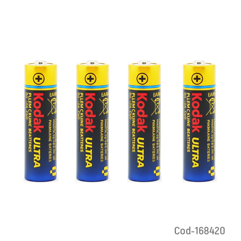 Pilas marca KODAK ultra premium alcalinas tipo AAA de 1.5 volt. Ofrecen alto rendimiento y durabilidad, ideales para dispositivos de uso constante. Producto en blíster con set de 4 unidades.