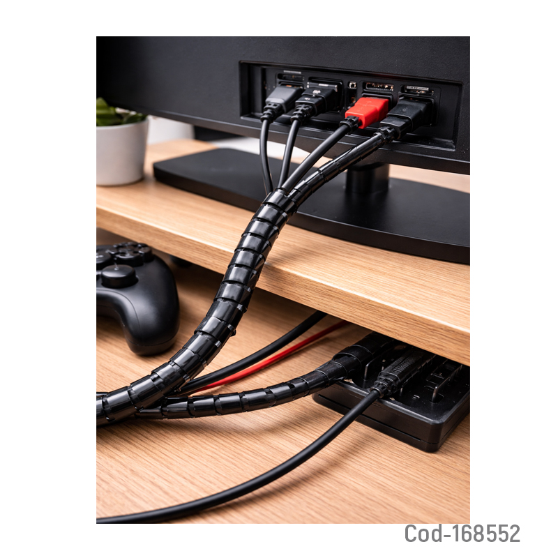 Funda para cable en espiral fabricada en PVC, con longitud de 10 metros. Ideal para proteger, ordenar y prolongar la vida útil de los cables. Producto presentado en bolsa.