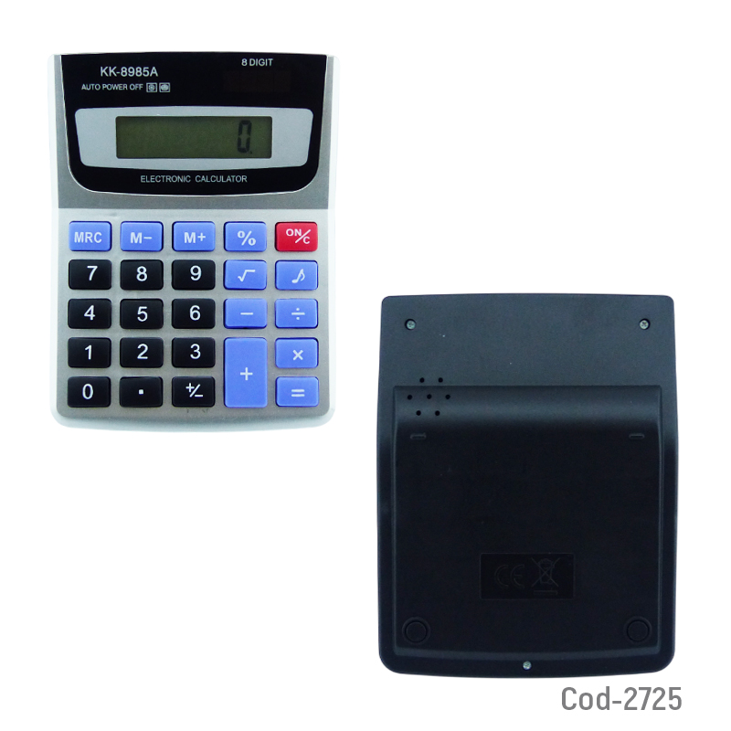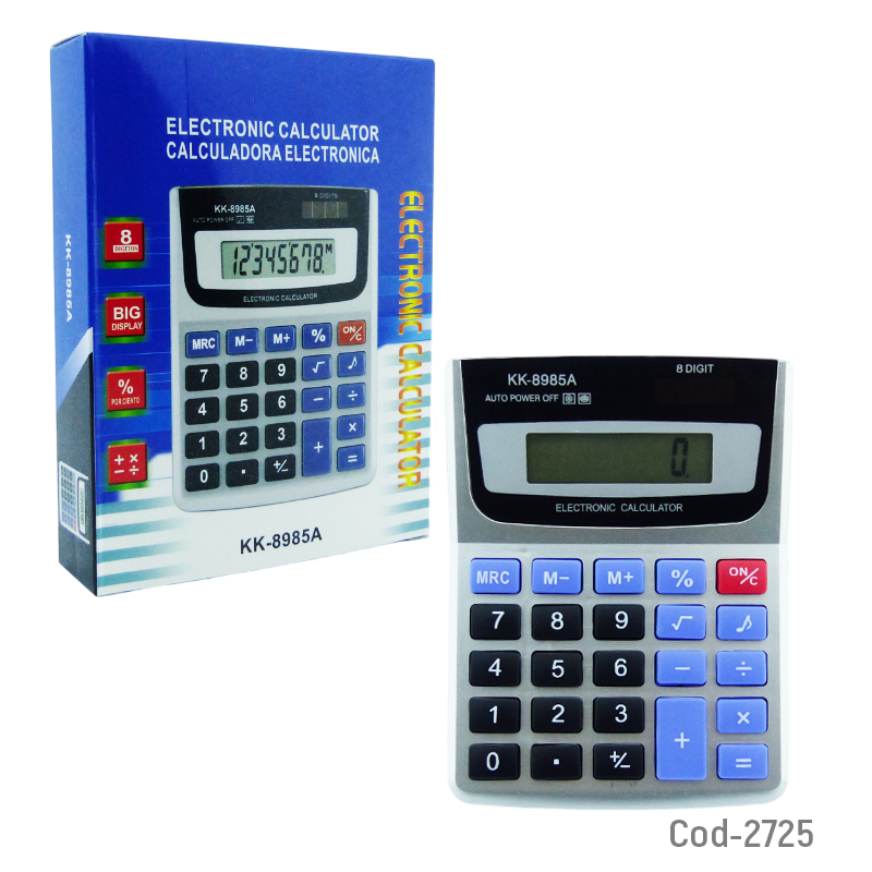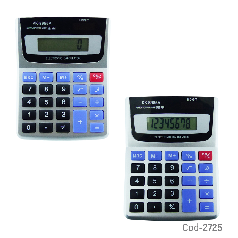 Calculadora modelo KK-8985A de 8 dígitos, ideal para uso escolar, oficina o comercio. Diseño compacto y fácil de usar, con teclas cómodas y pantalla clara para una lectura precisa. Producto de alta calidad en caja.